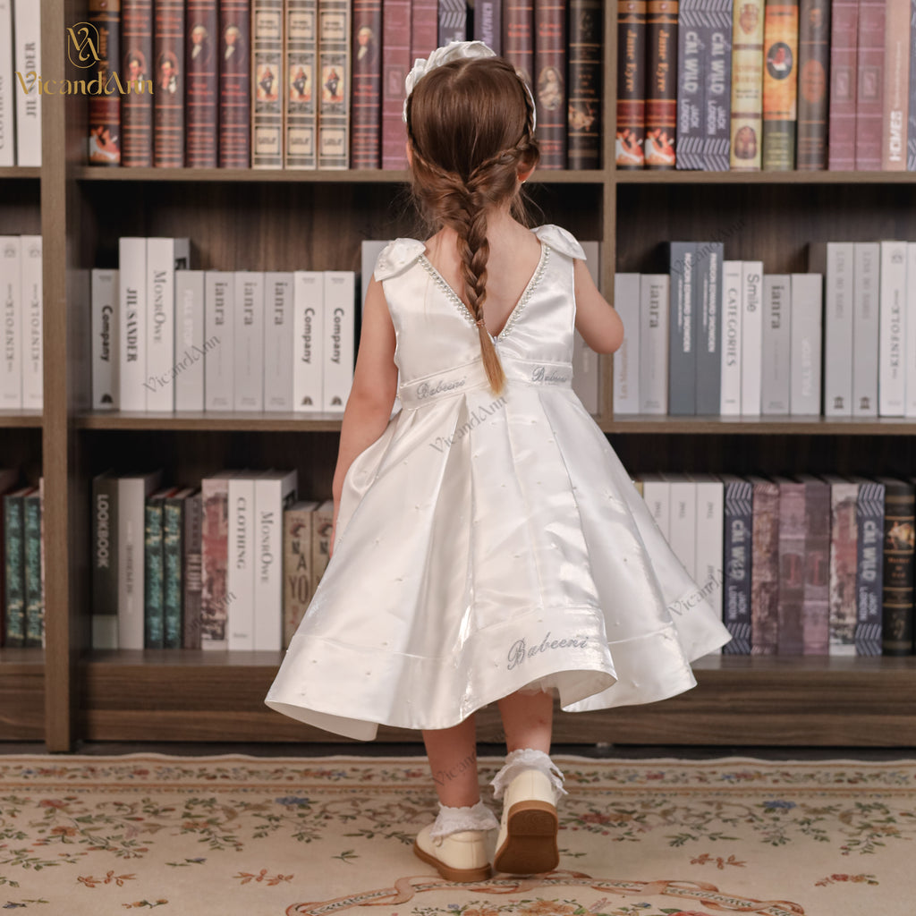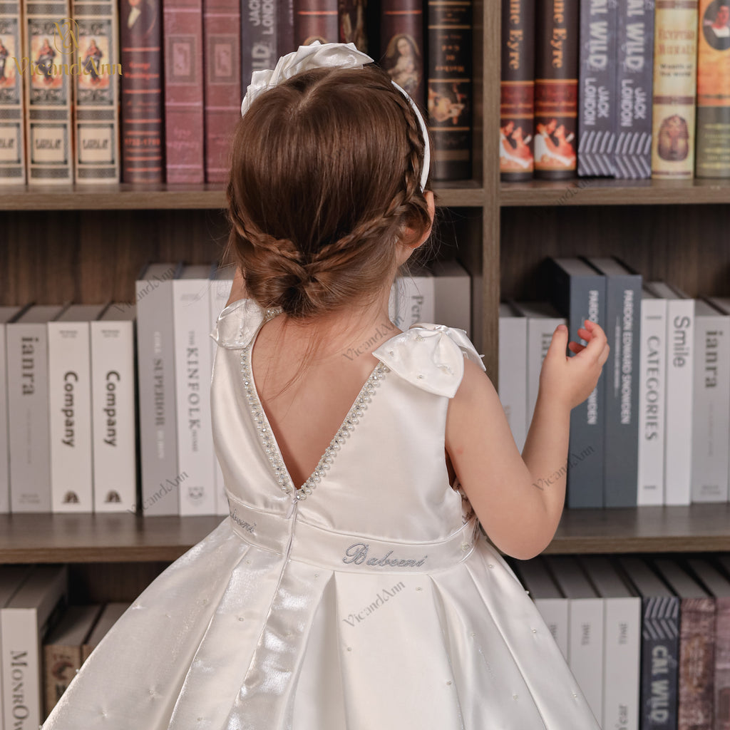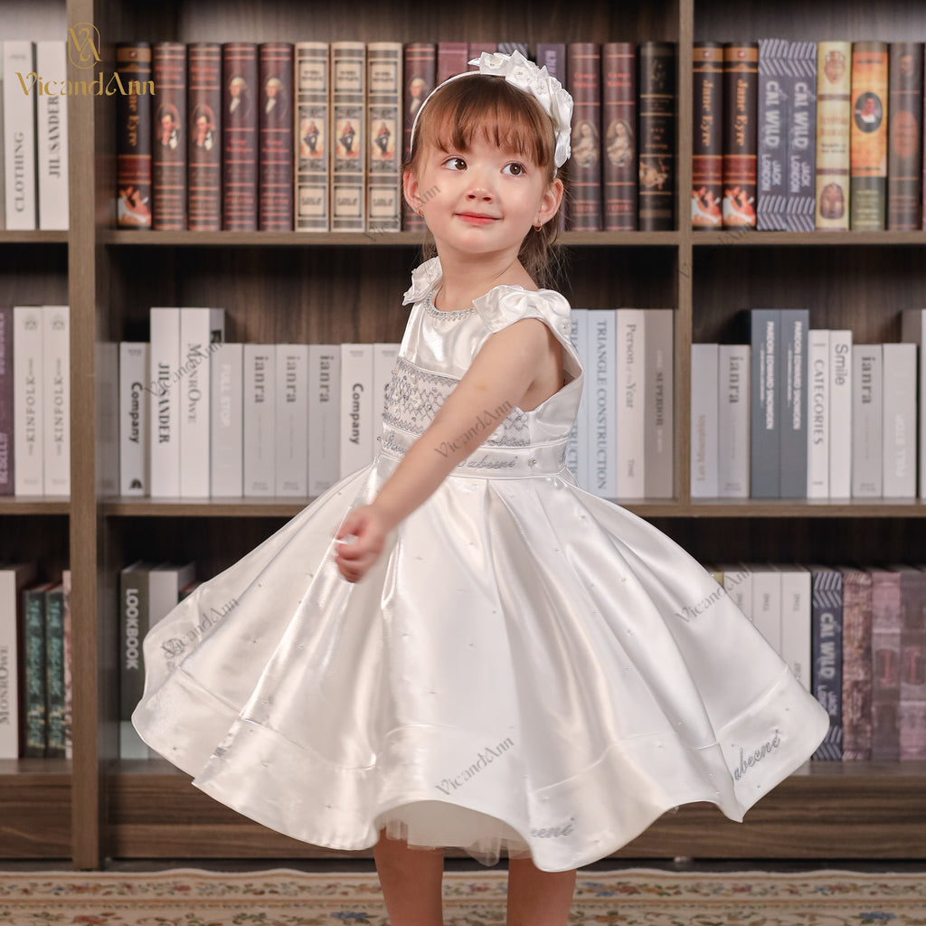 Feature: A luxurious layered organza dress adorned with glitter-thread hand embroidery, silver beads, and 3D floral appliqués. The smocked chest with pearl-beaded neckline adds elegance, while bow shoulders and embellished hem create a graceful silhouette. Comes with a matching pleated headband for a refined finish.