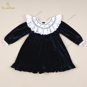 Feature: This beautifully crafted flared velvet dress combines classic craftsmanship with romantic details. It features hand-smocked embroidery on the chest, delicate lace accents, and a soft ruffled hem that adds movement and charm. A perfect piece for special occasions, holiday photos, or premium boutique collections.