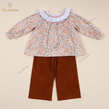 Girls' Corduroy Set with Smocked Collar Top and Matching Pants - VAG015