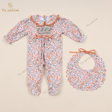 Baby Girl Floral Smocked Footie Romper with Matching Bib - VAI004