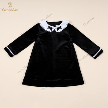 A-Line Velvet Dress with Corduroy Collar and Matching Bow - VAG016