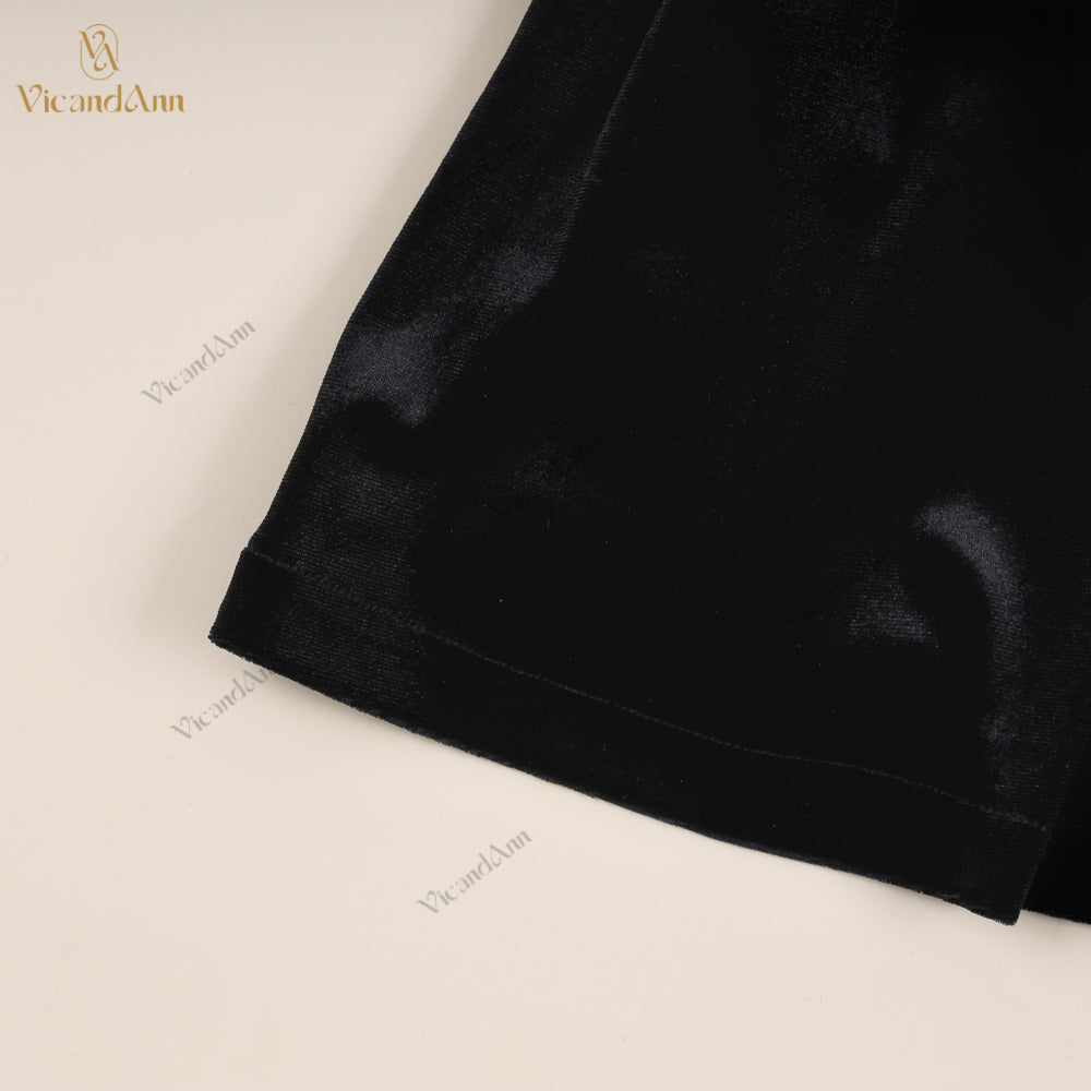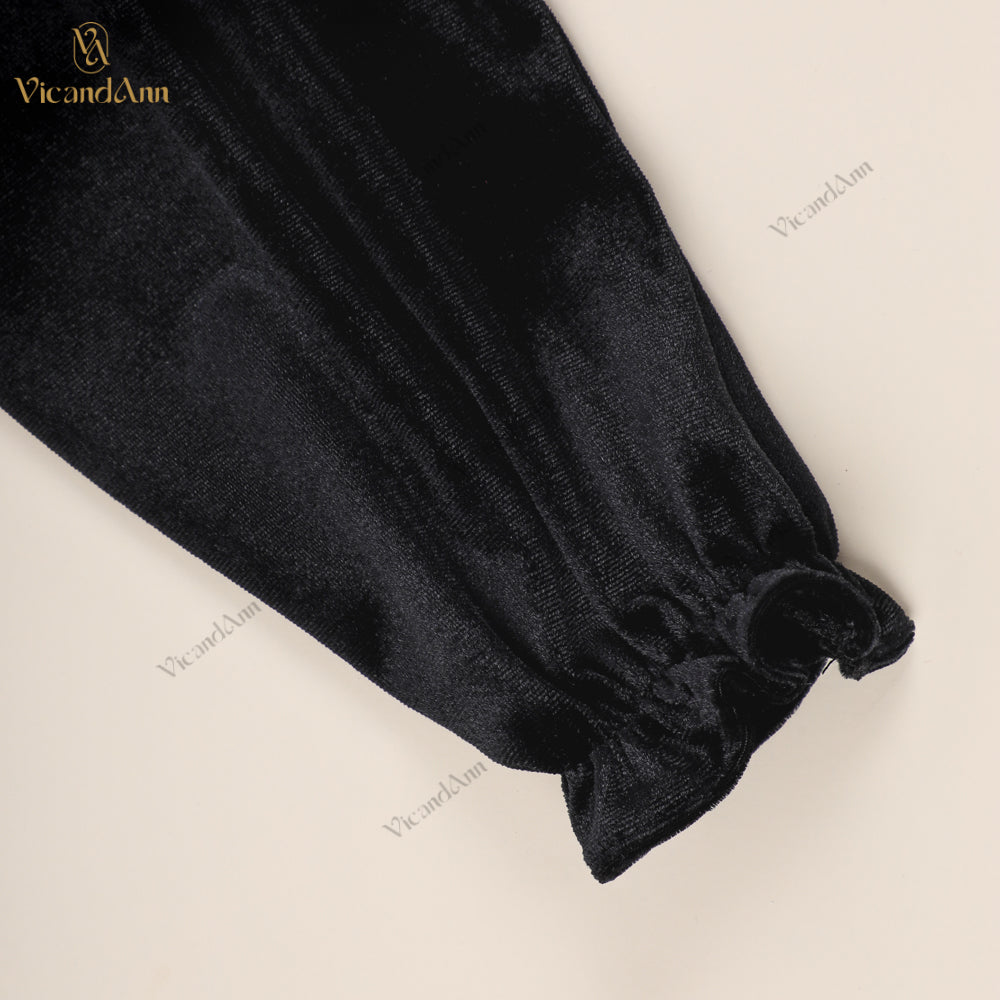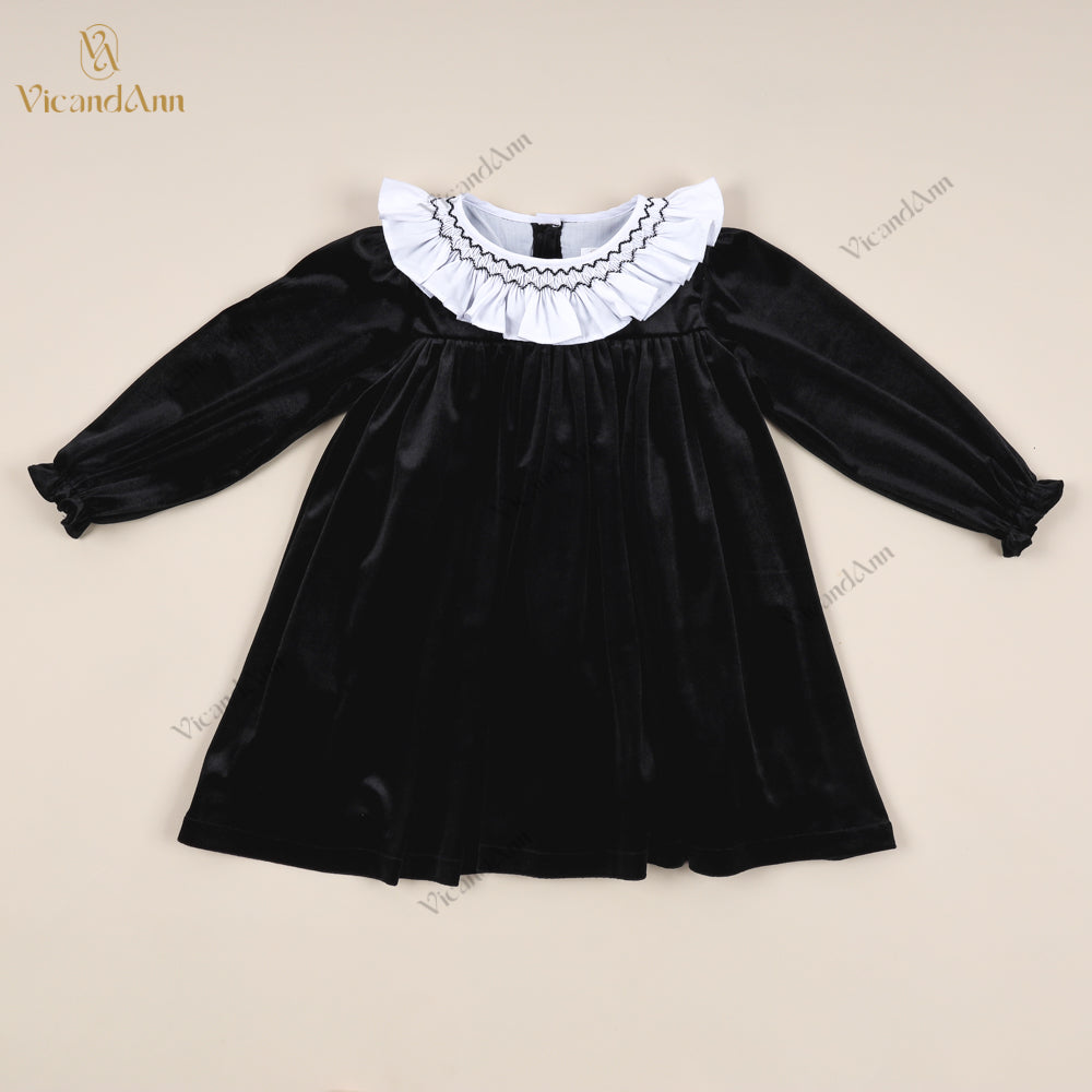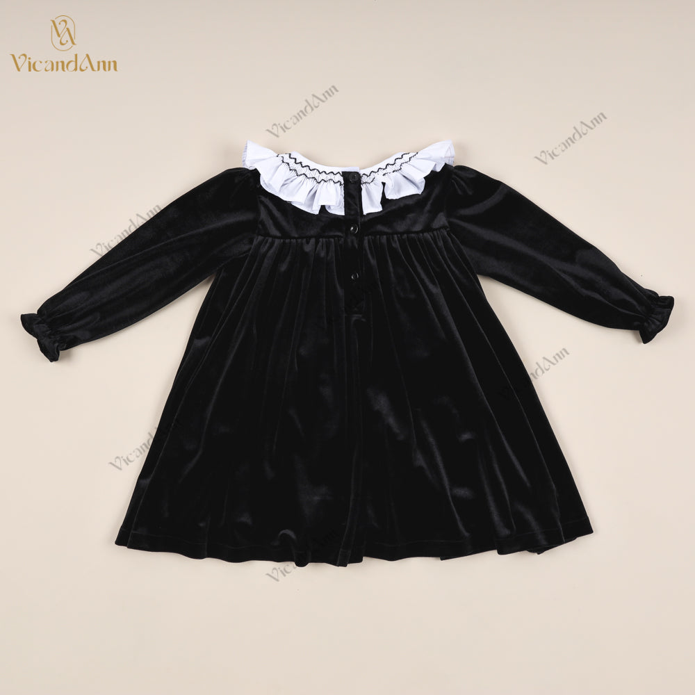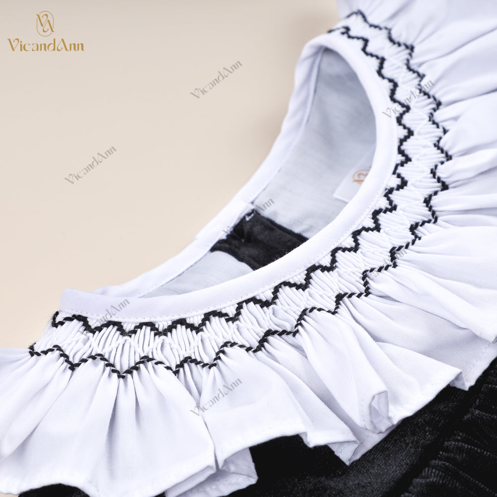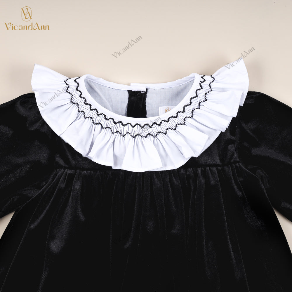 Black Velvet Dress with Ruffled Collar and Zigzag Hand Smocking - VAG022