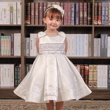 Feature: A luxurious layered organza dress adorned with glitter-thread hand embroidery, silver beads, and 3D floral appliqués. The smocked chest with pearl-beaded neckline adds elegance, while bow shoulders and embellished hem create a graceful silhouette. Comes with a matching pleated headband for a refined finish.