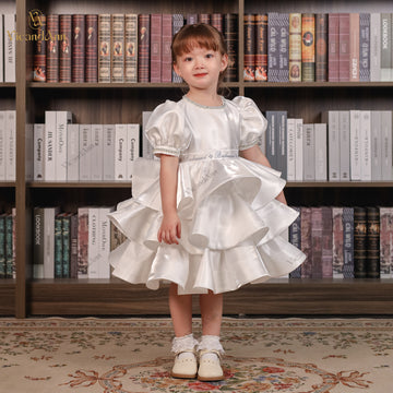 Feature: A luxurious three-tier dress crafted with layered mesh underskirt for natural volume. The pearl-crystal neckline and sleeves shimmer with elegance, while the metallic-thread waistband and delicate back cut-out add a refined touch. Perfect for special occasions where sophistication meets charm.