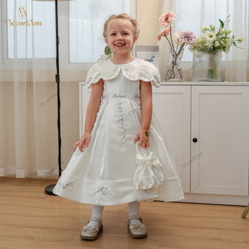 Feature: An opulent mesh-organza dress adorned with over 250 hand-embroidered 3D blossoms, enhanced by shimmering silver-thread embroidery, pearls, and bead accents. The neckline and bodice glisten with meticulous craftsmanship, while the flowing skirt adds graceful volume. Paired with a matching pearl-strap handbag (KB100) for a touch of timeless sophistication.