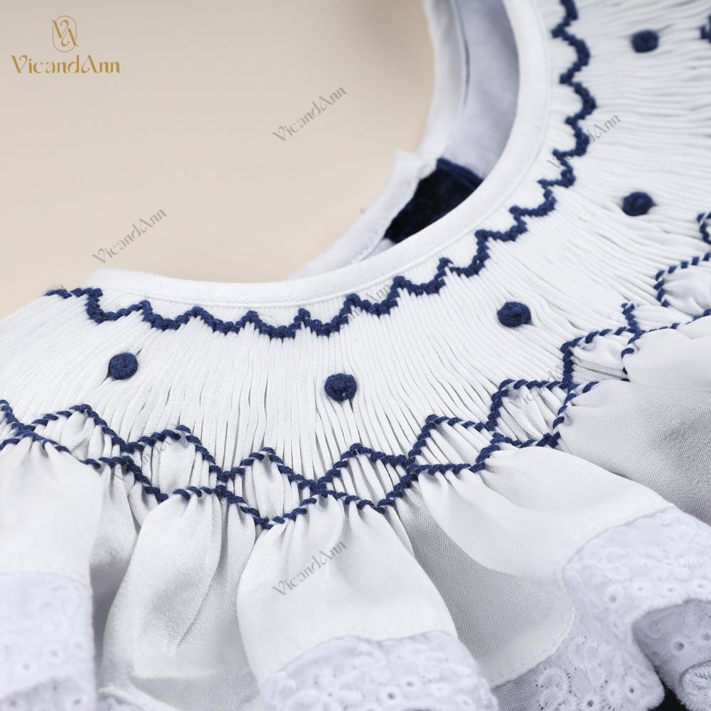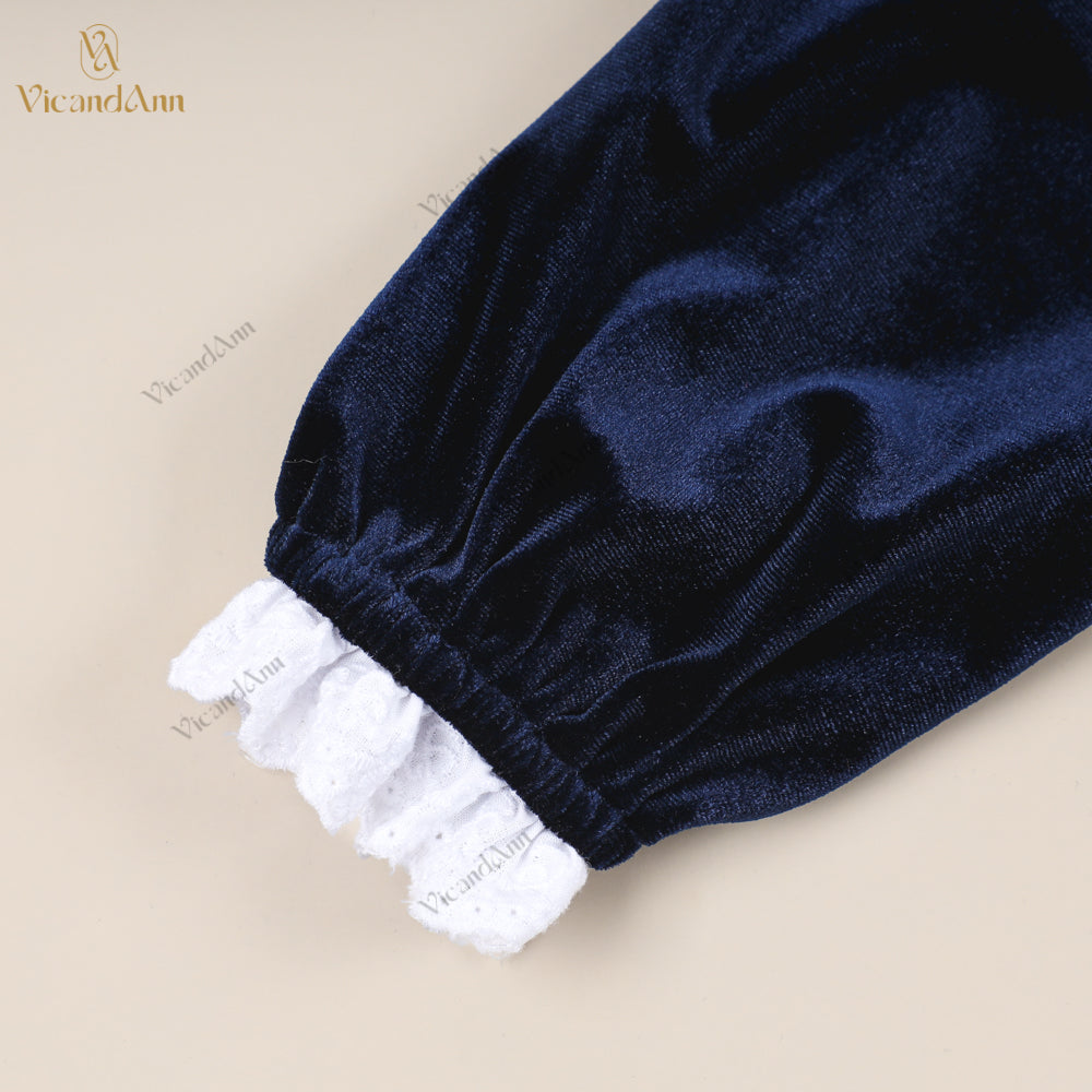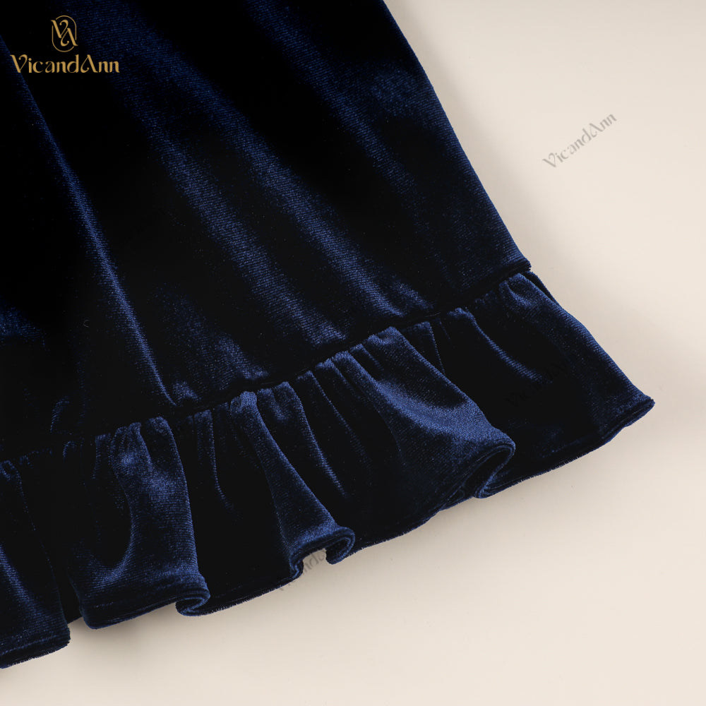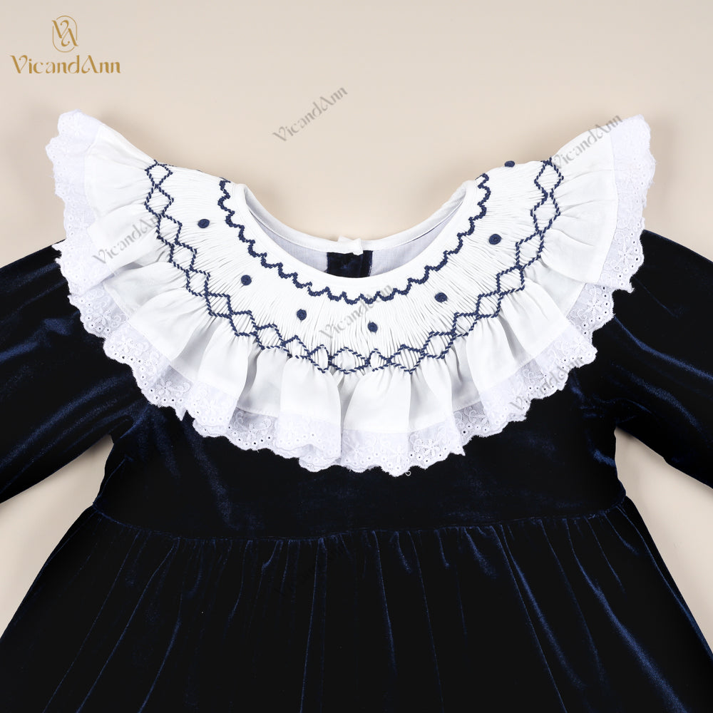 Feature: This beautifully crafted flared velvet dress combines classic craftsmanship with romantic details. It features hand-smocked embroidery on the chest, delicate lace accents, and a soft ruffled hem that adds movement and charm. A perfect piece for special occasions, holiday photos, or premium boutique collections.
