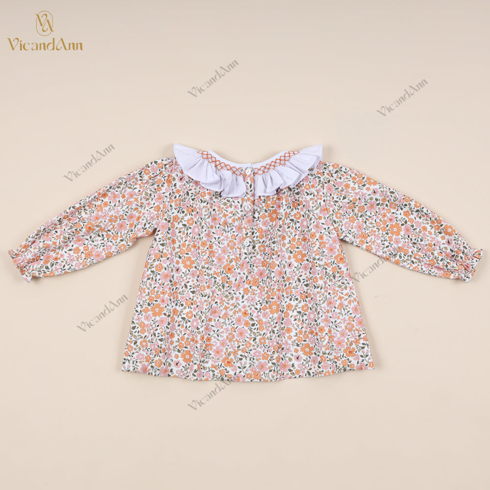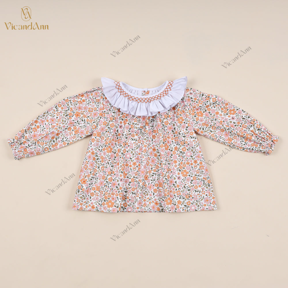 Feature: This sweet A-line top is made from soft corduroy and features a short flared silhouette that pairs effortlessly with pants or skirts. The standout white collar is hand-smocked and delicately ruffled, adding a refined vintage look. Puff sleeves with elastic cuffs complete the charming design.