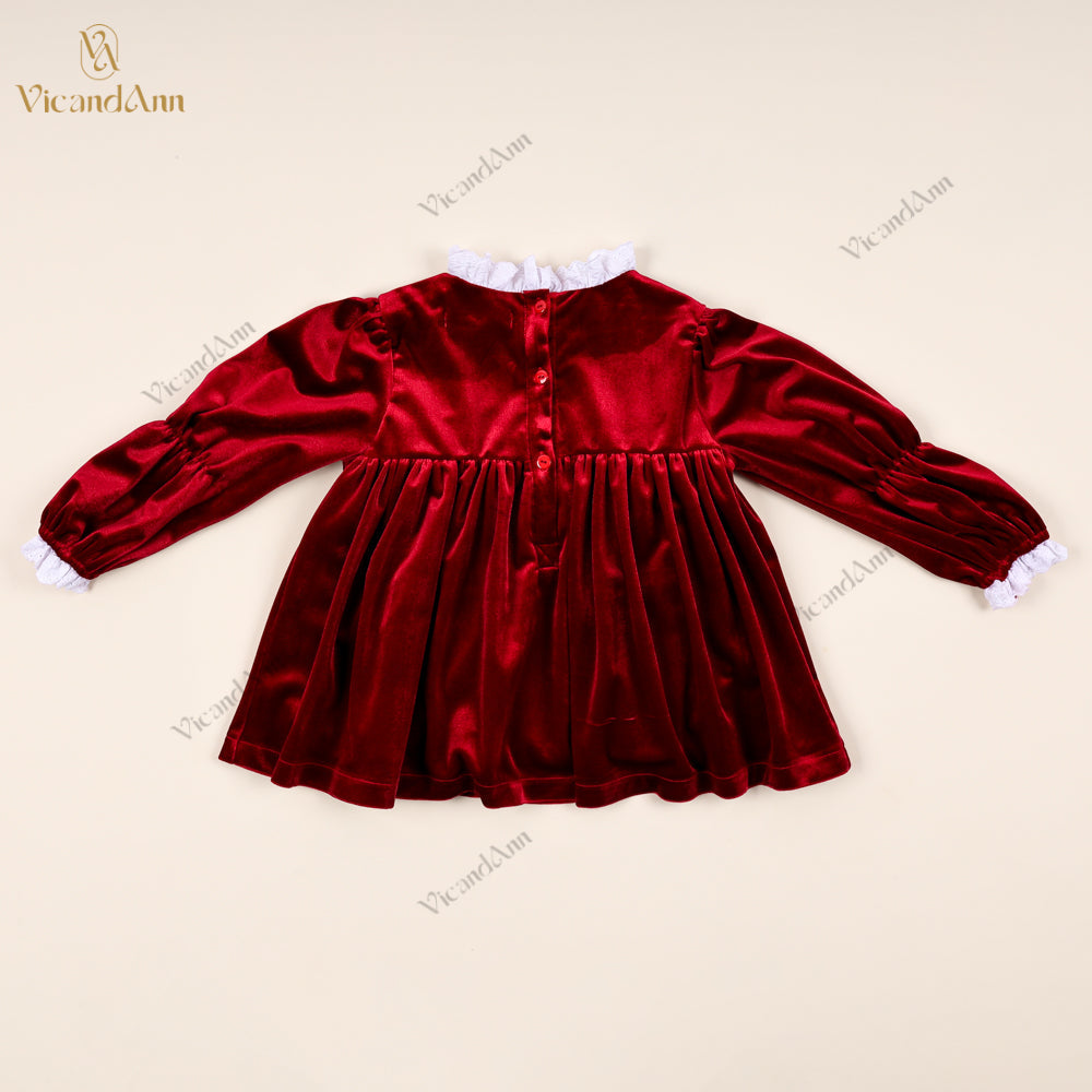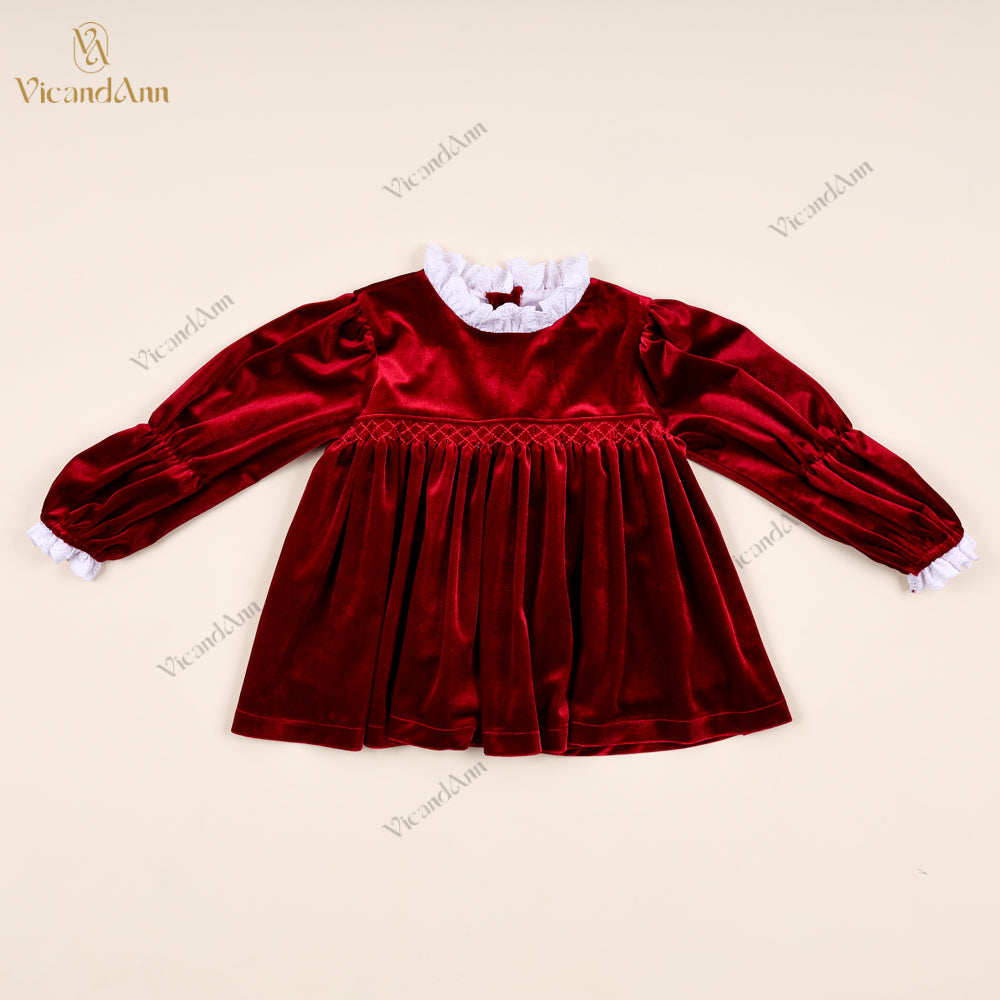 Feature: This luxurious red velvet top is fully lined for extra warmth and crafted from 2-way stretch fabric to ensure comfort and flexibility. It features hand-smocked embroidery at the chest with velvet pleating accents, a delicate lace-trimmed collar, and elasticated cuffs for a snug, elegant finish. Ideal for cooler seasons and festive dressing.